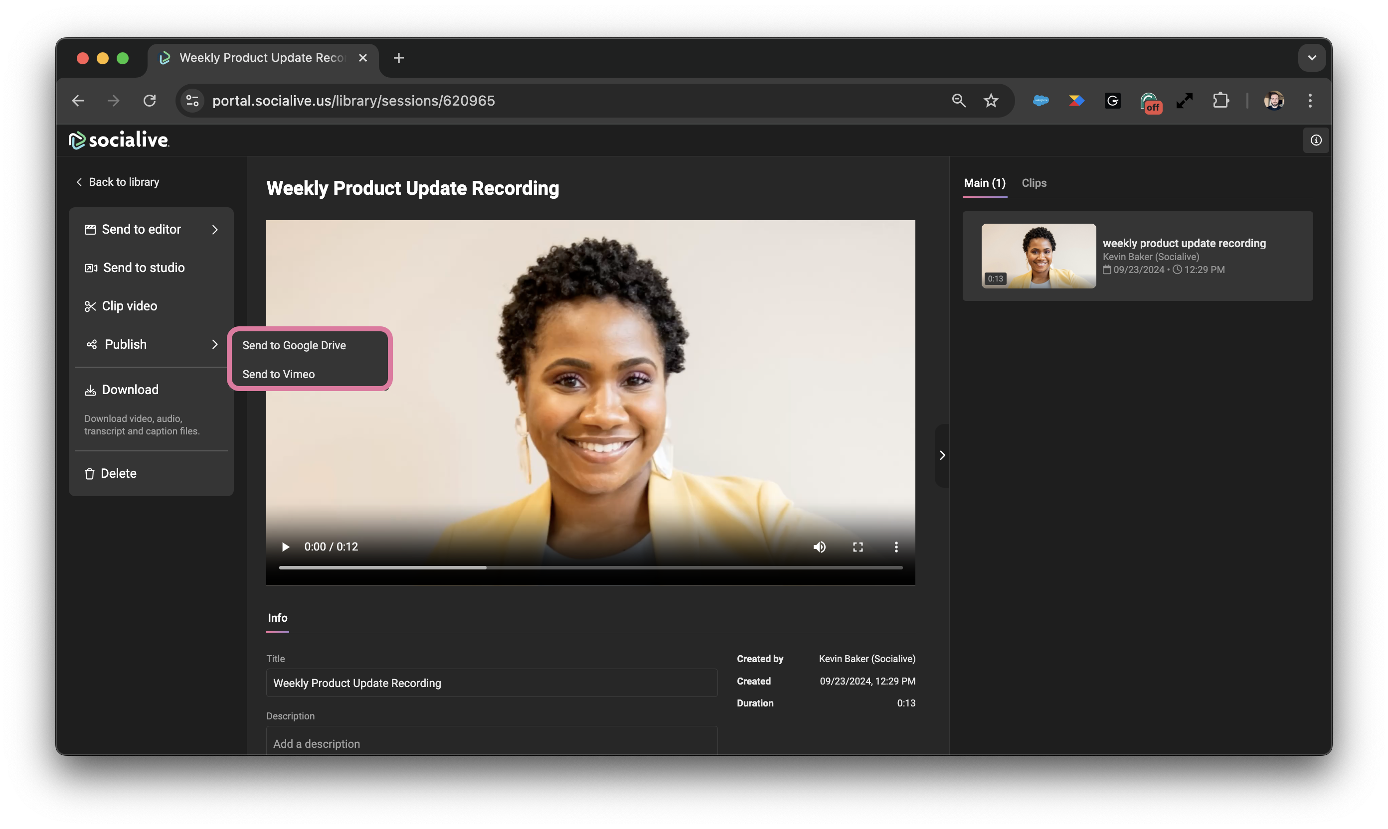 A Socialive admin must add an integration to your account. Once the integration is set up, Socialive Admins can send files to that destination. To send a file, click the share video button from the Library.