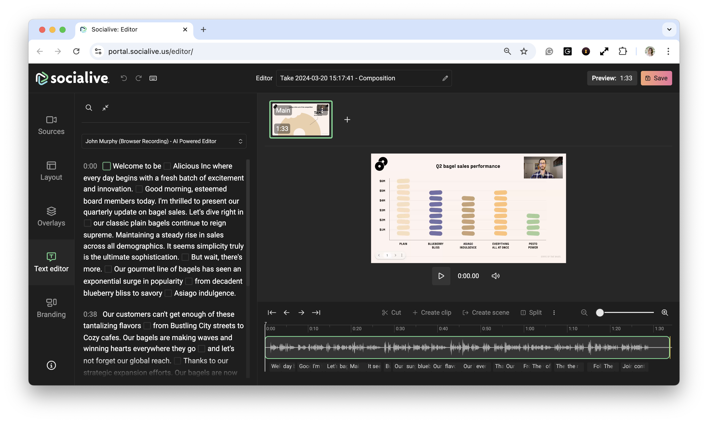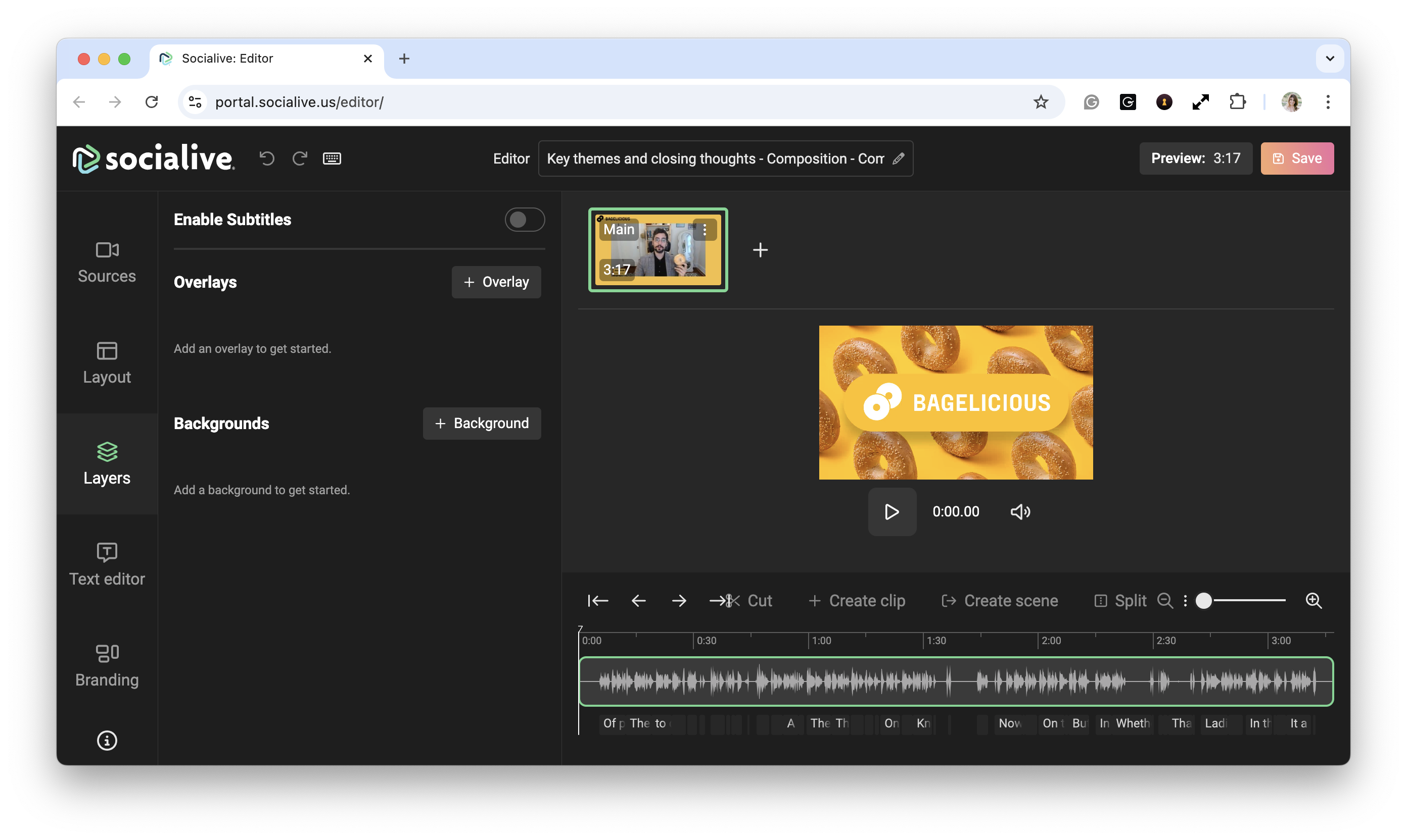 The Editor is the interface where Admins, Producers, and Creators can take recorded content edit it. Creating a high-quality video with graphics, branding, nametags, and logos is easy and quick with the Socialive Editor.