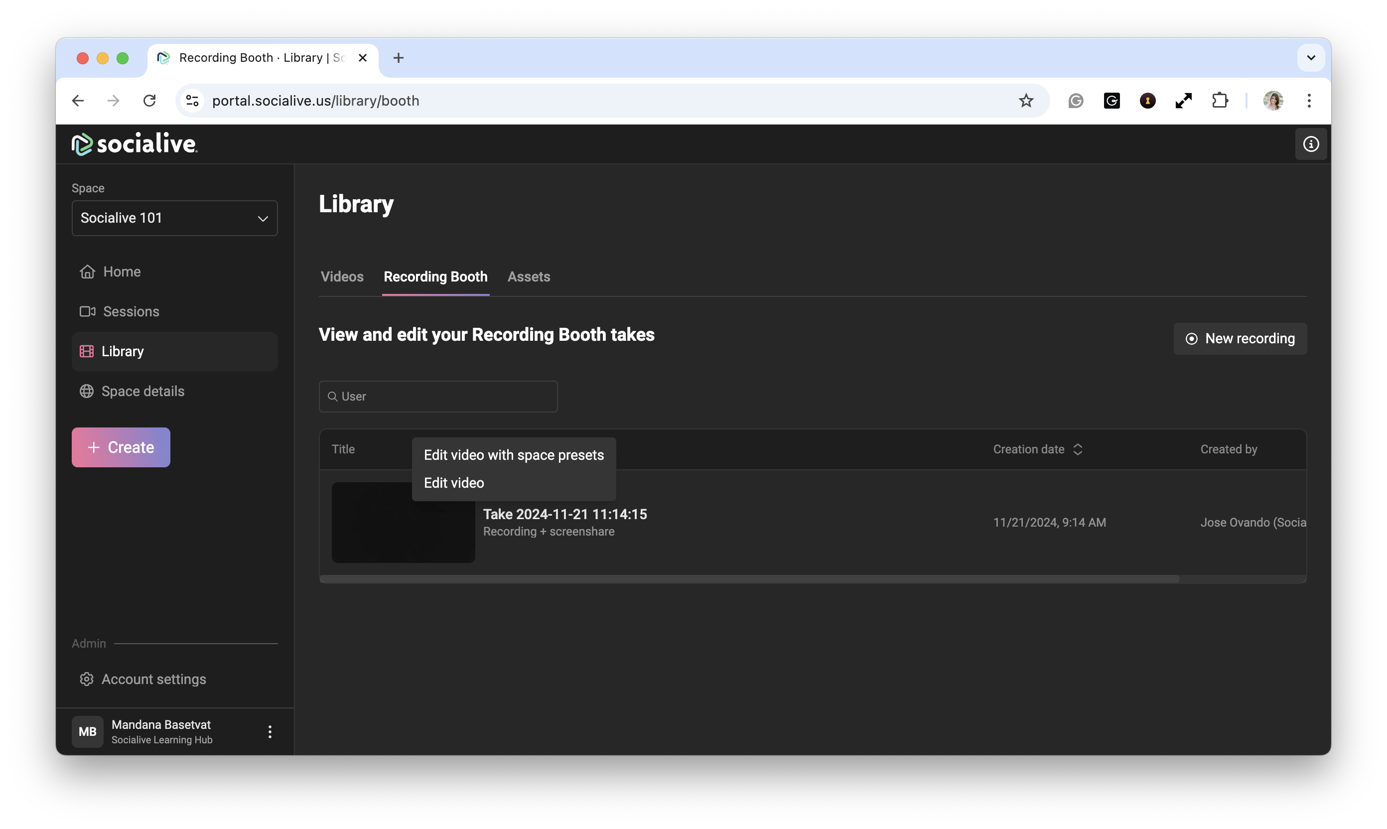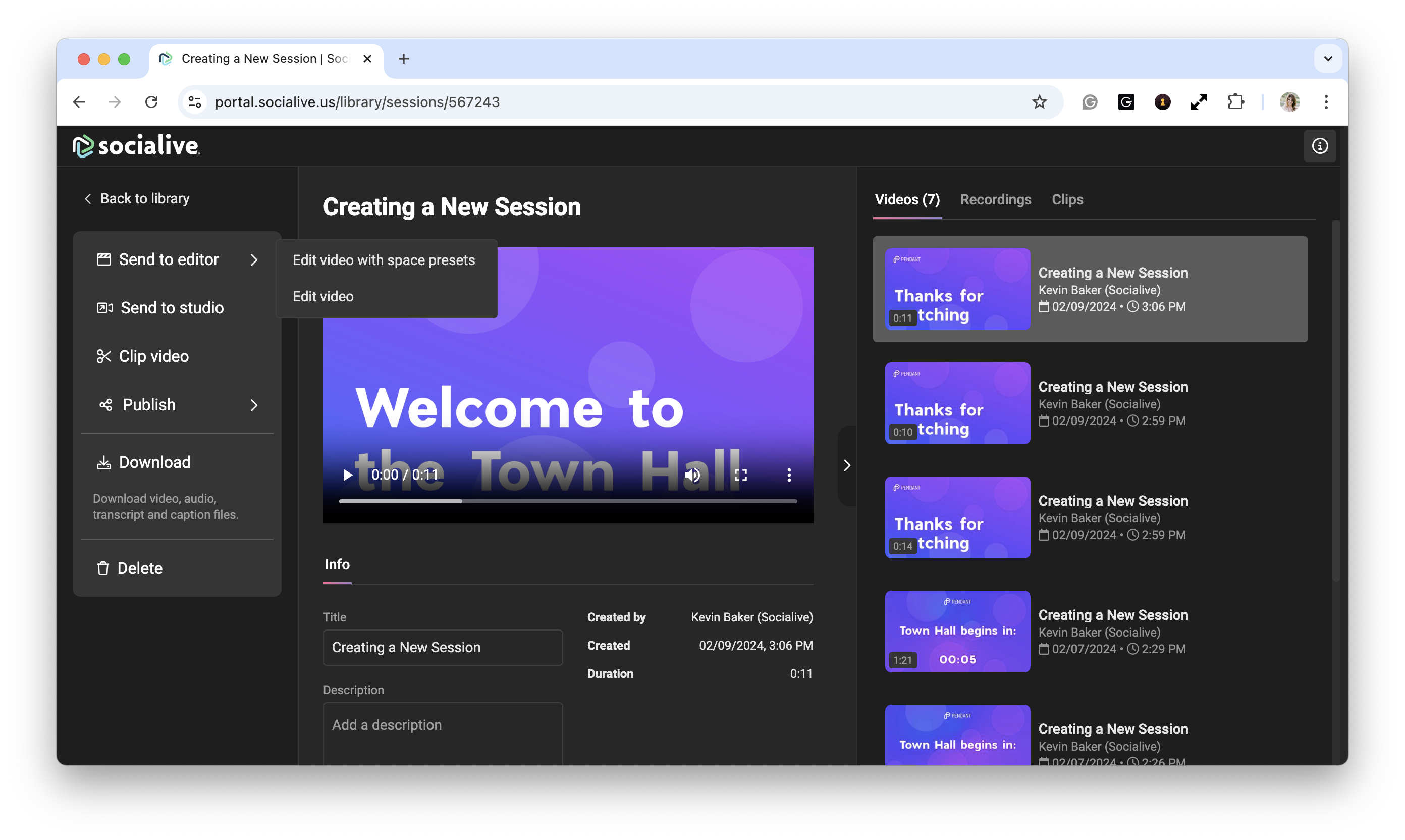 From the videos tab in the Library, select the recording to be edited - this can be a video from a Studio recording, an individual ISO, or a video uploaded to the library (including screen share videos)