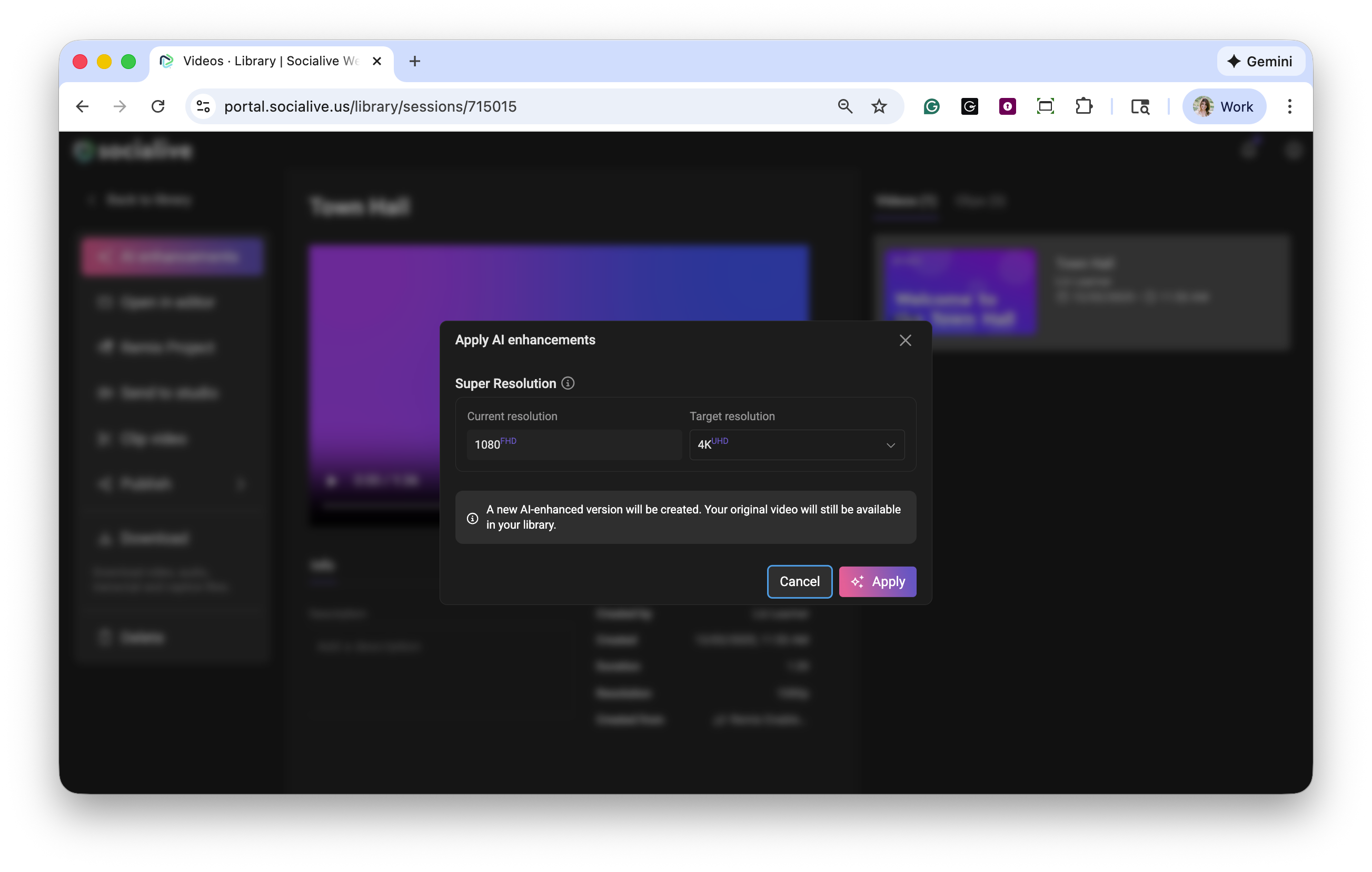 1. Once Super Res has been applied to the video, the AI icon will display as being in use in the Library.